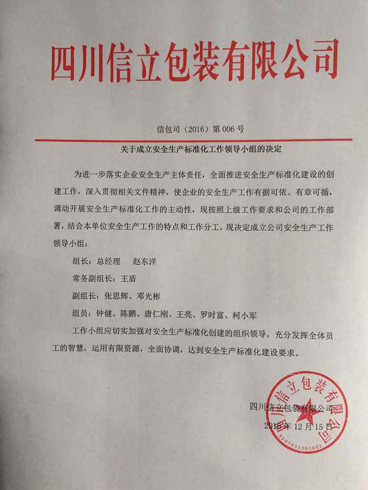 關(guān)于成立安全生產(chǎn)標(biāo)準(zhǔn)化工作領(lǐng)導(dǎo)小組的決定